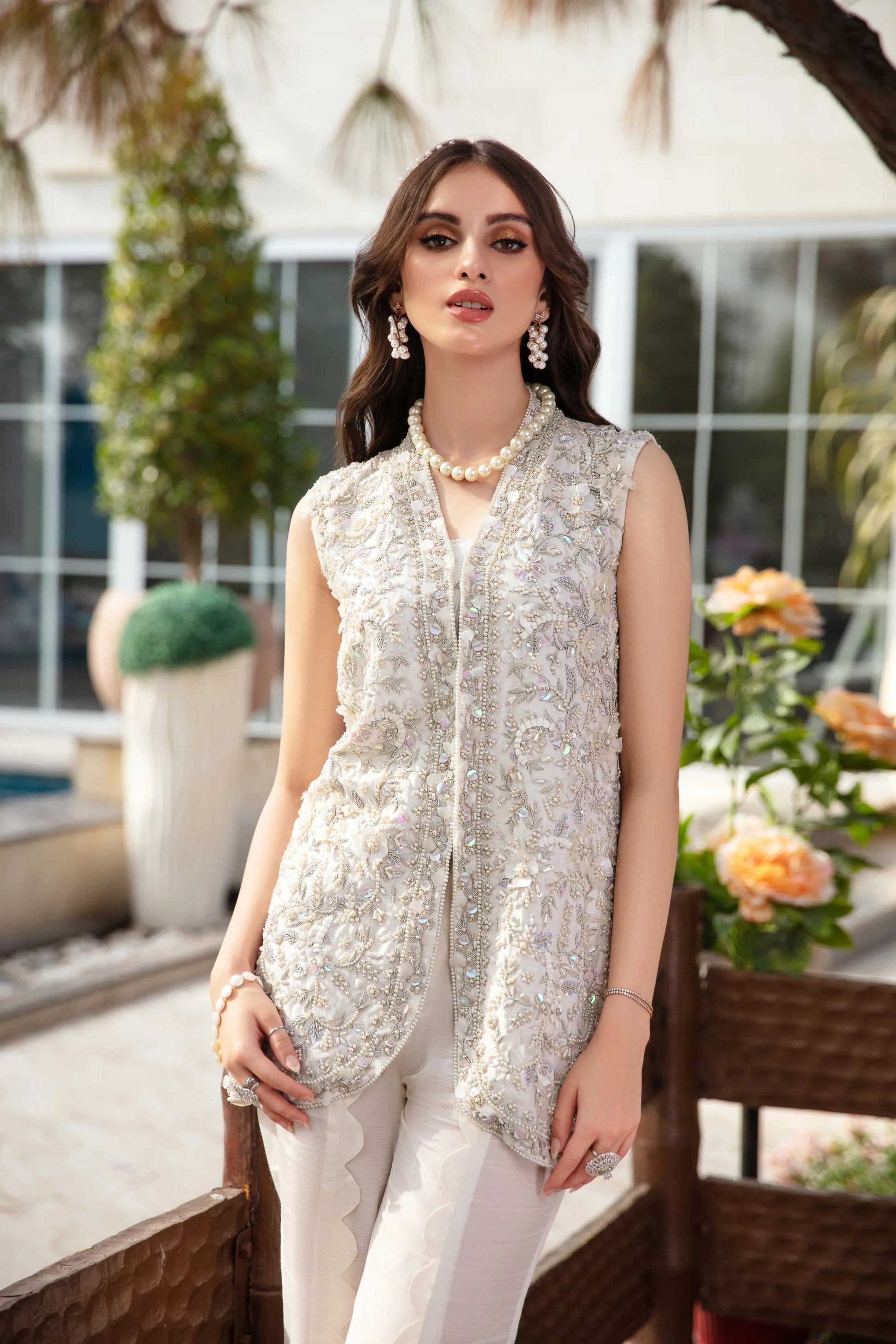 Ivory Whisper is a vision of timeless sophistication. This exquisitely crafted jacket showcases intricate hand embroidery and delicate 3D floral accents, bringing texture and elegance together in perfect harmony. Designed for versatility and grace, its dreamy silhouette transitions seamlessly from festive gatherings to evening soirees. Paired with scalloped front-slit trousers, this ensemble radiates refined charm with every step.