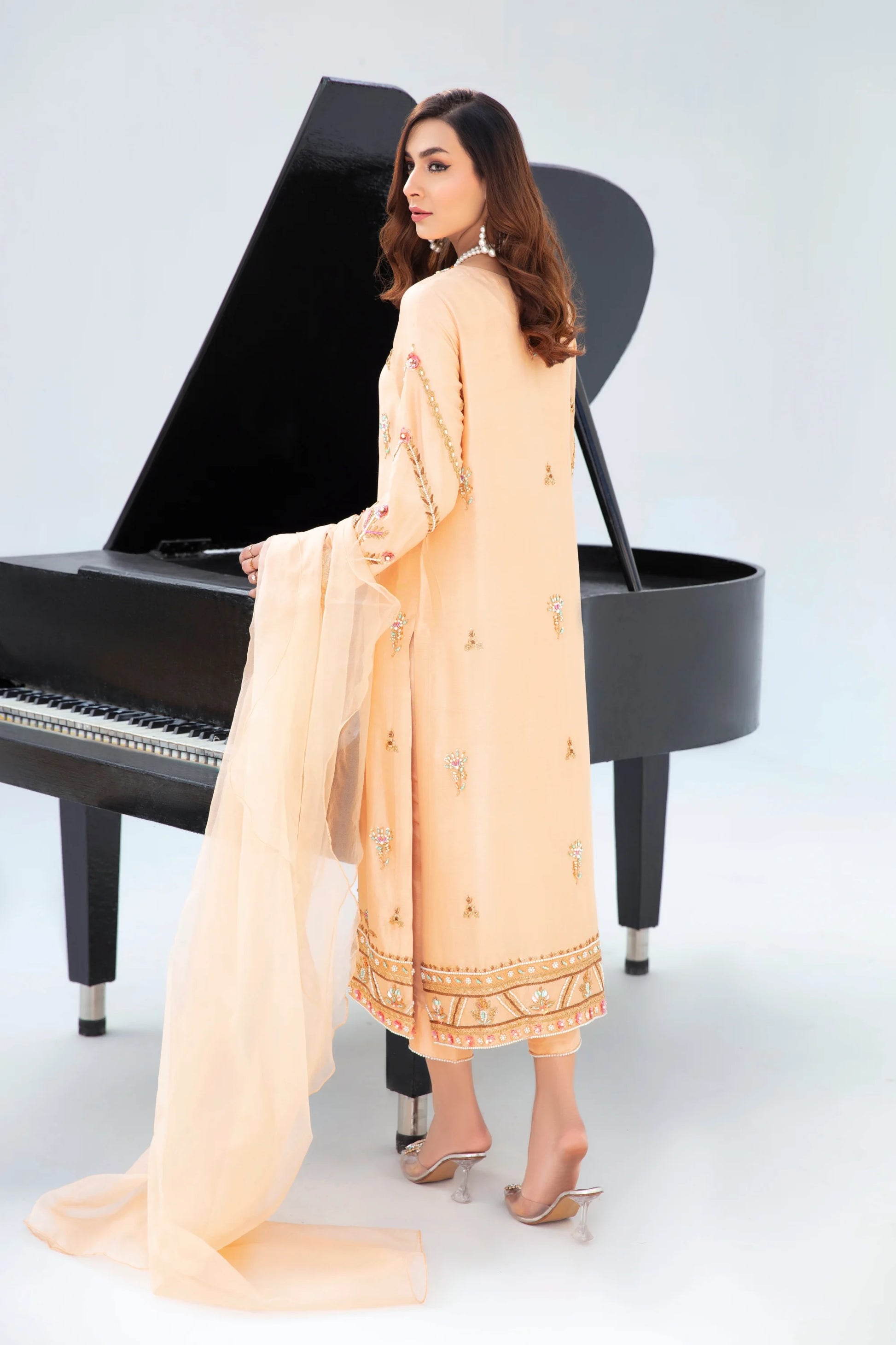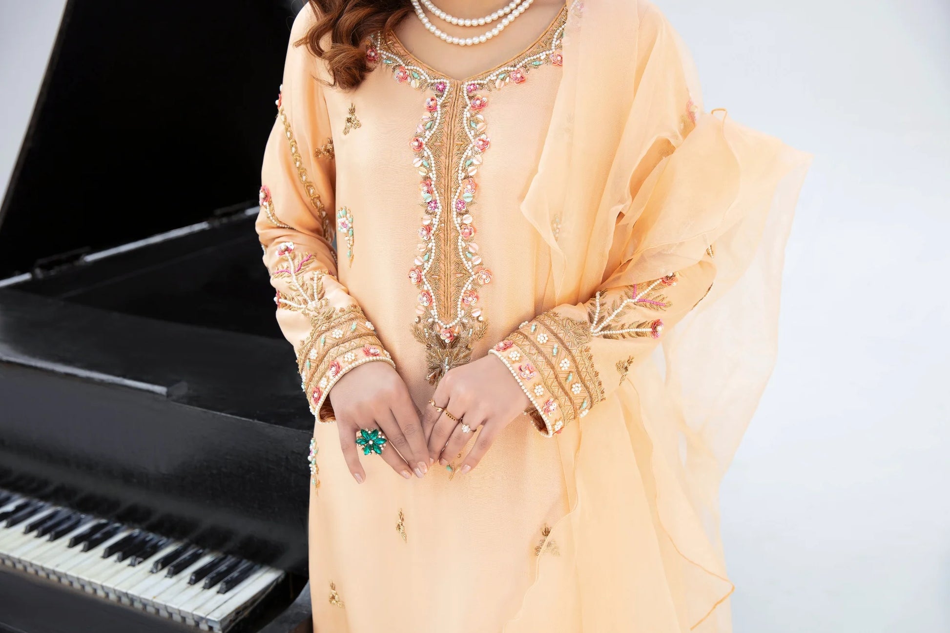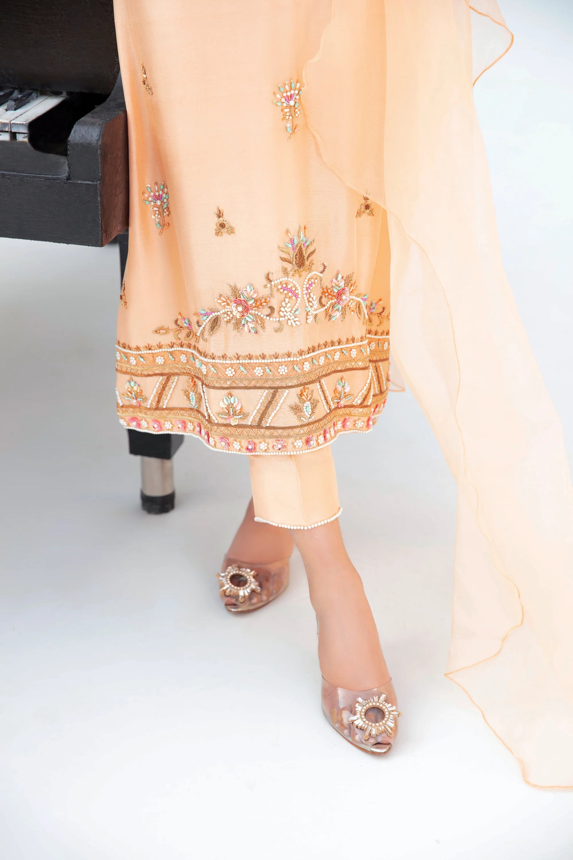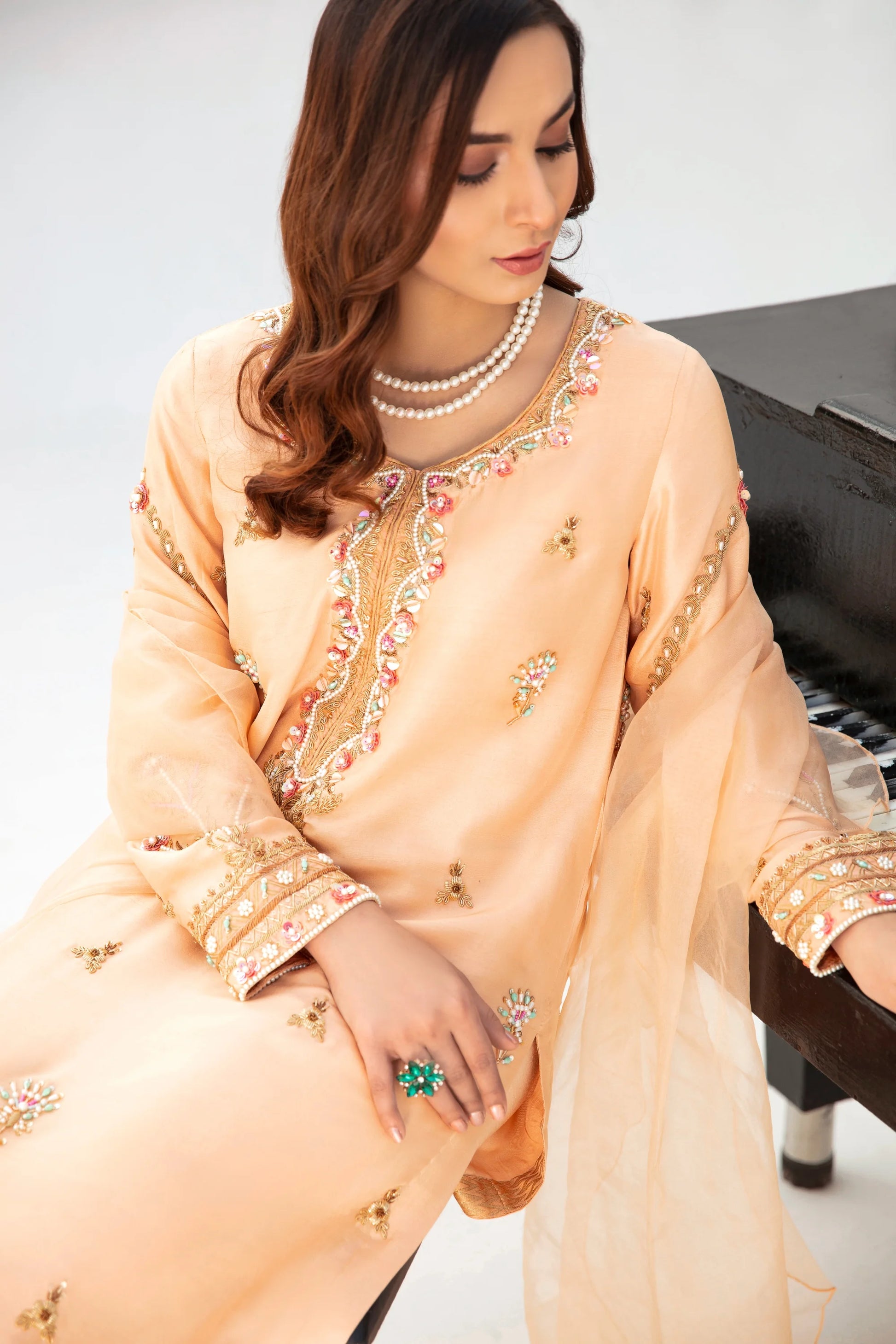 Marjan is a beautifully crafted piece in soft pastel hues, designed for those who seek both elegance and charm. This long shirt is artfully worked on both the front and back with contrasting shades and subtle hints of ferozee. The neckline and hem are adorned with vibrant pops of pink florals and meticulously handcrafted motifs that bring depth and interest to this timeless piece. Paired with cigarette trousers for a sleek finish and an organza ruffle dupatta to add a delicate touch. Available in both black and peach, Marjan is the perfect blend of tradition and contemporary style.