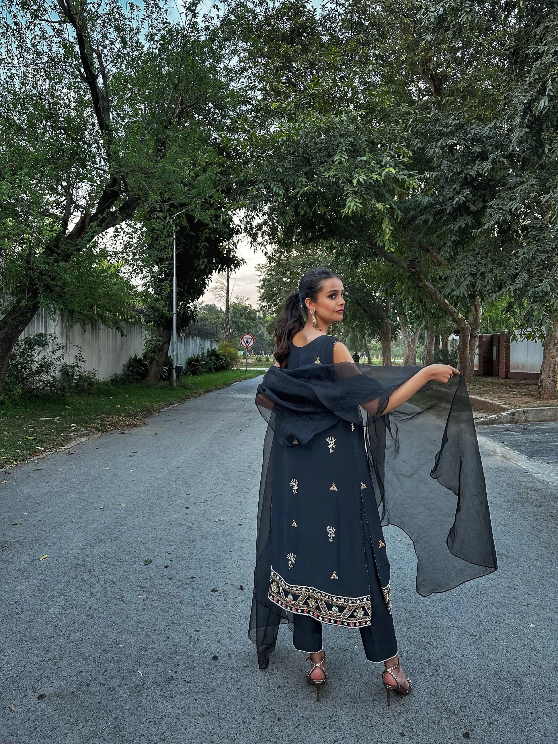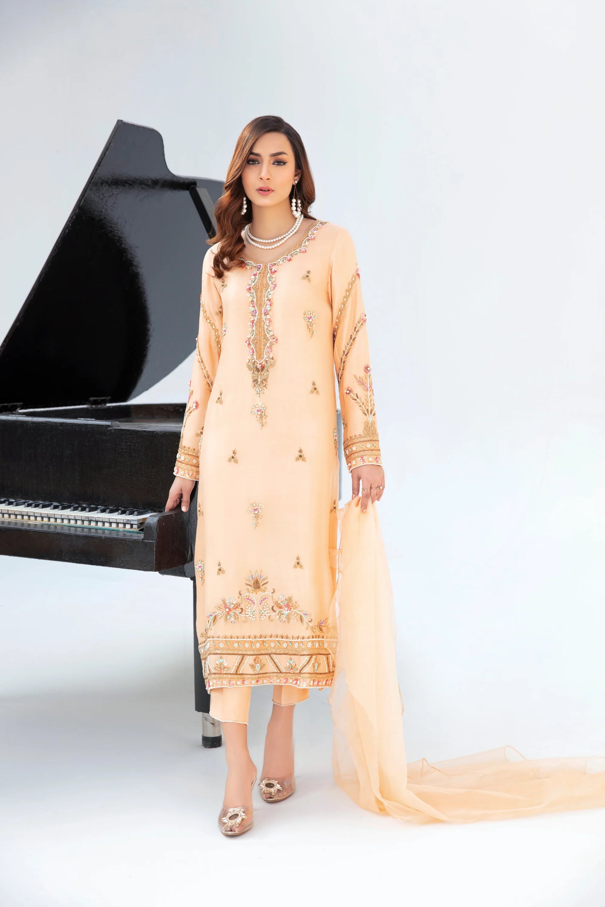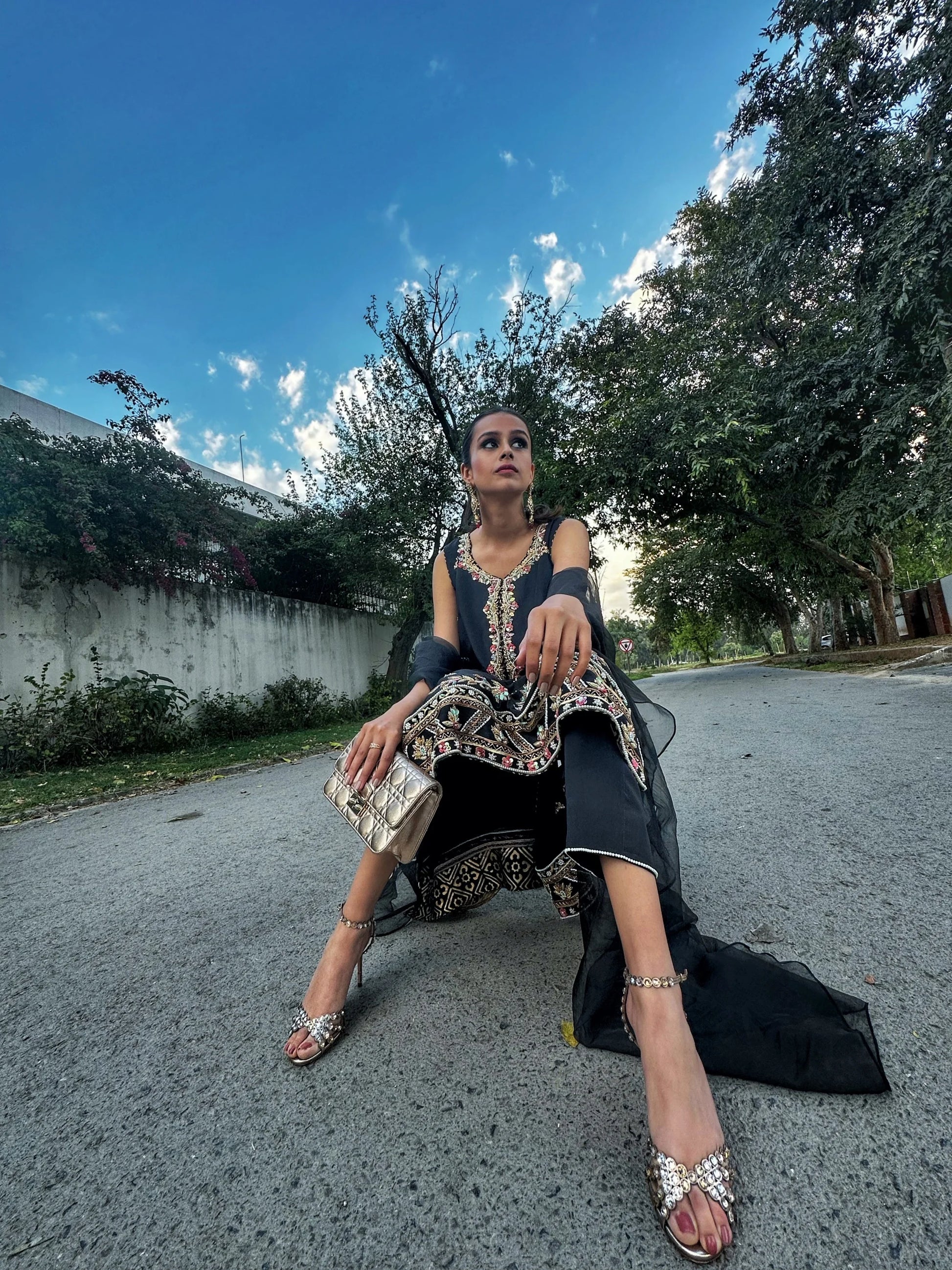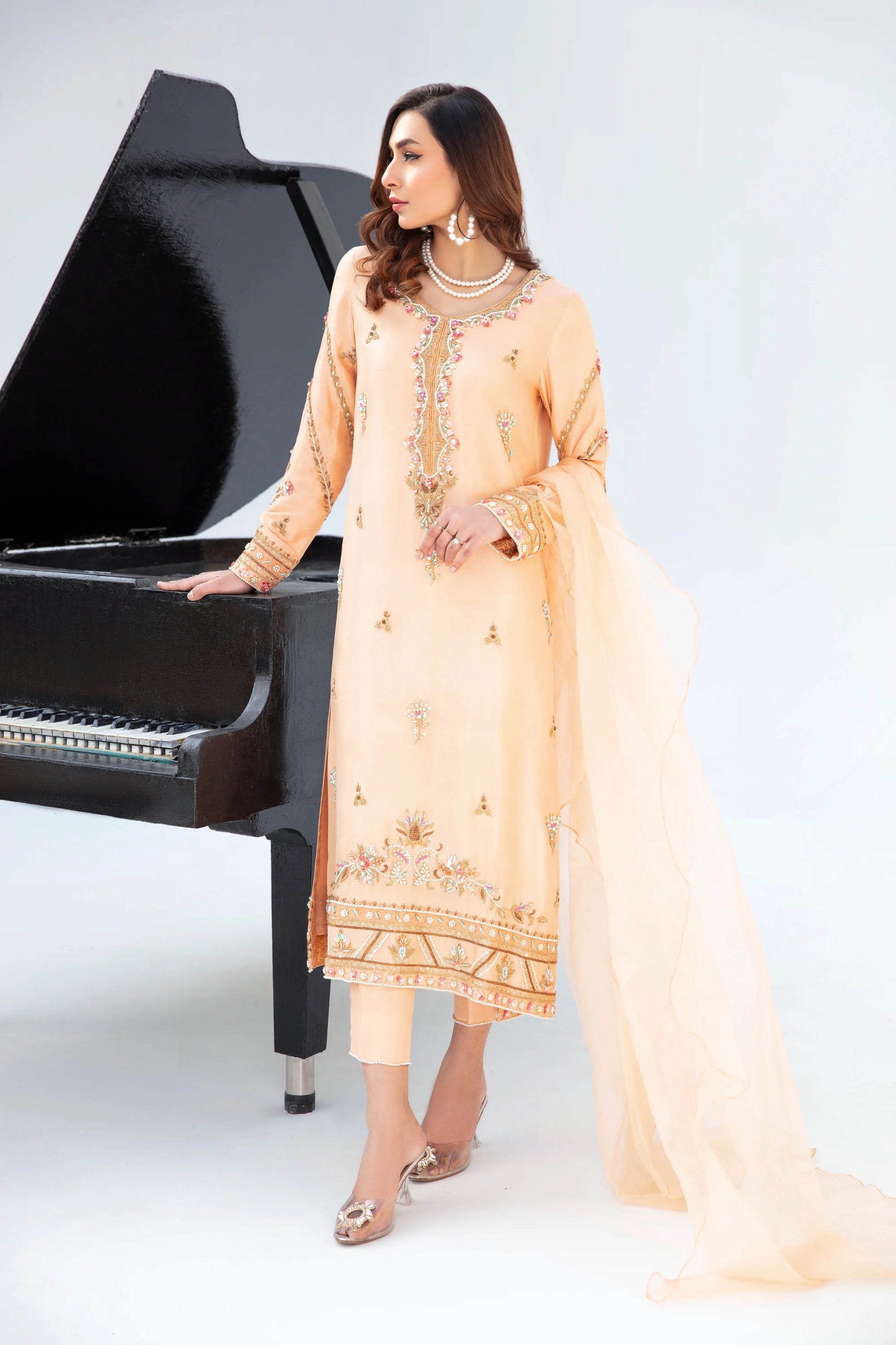 Marjan is a beautifully crafted piece in soft pastel hues, designed for those who seek both elegance and charm. This long shirt is artfully worked on both the front and back with contrasting shades and subtle hints of ferozee. The neckline and hem are adorned with vibrant pops of pink florals and meticulously handcrafted motifs that bring depth and interest to this timeless piece. Paired with cigarette trousers for a sleek finish and an organza ruffle dupatta to add a delicate touch. Available in both black and peach, Marjan is the perfect blend of tradition and contemporary style.