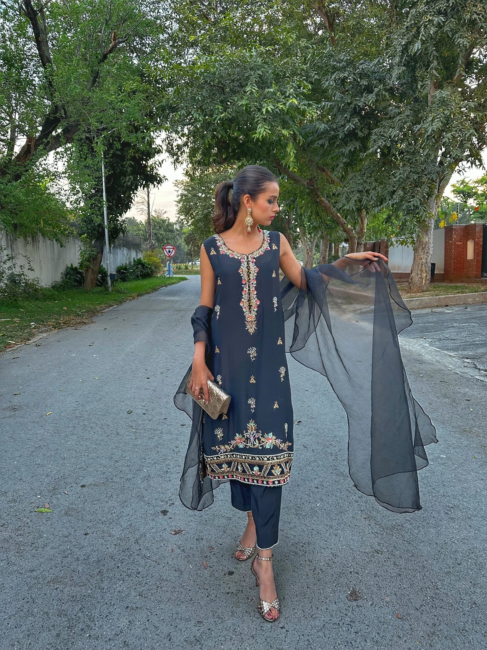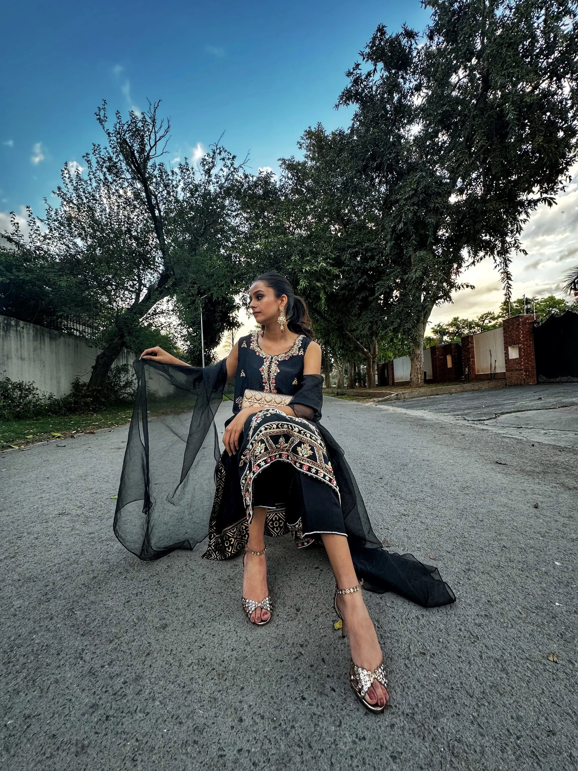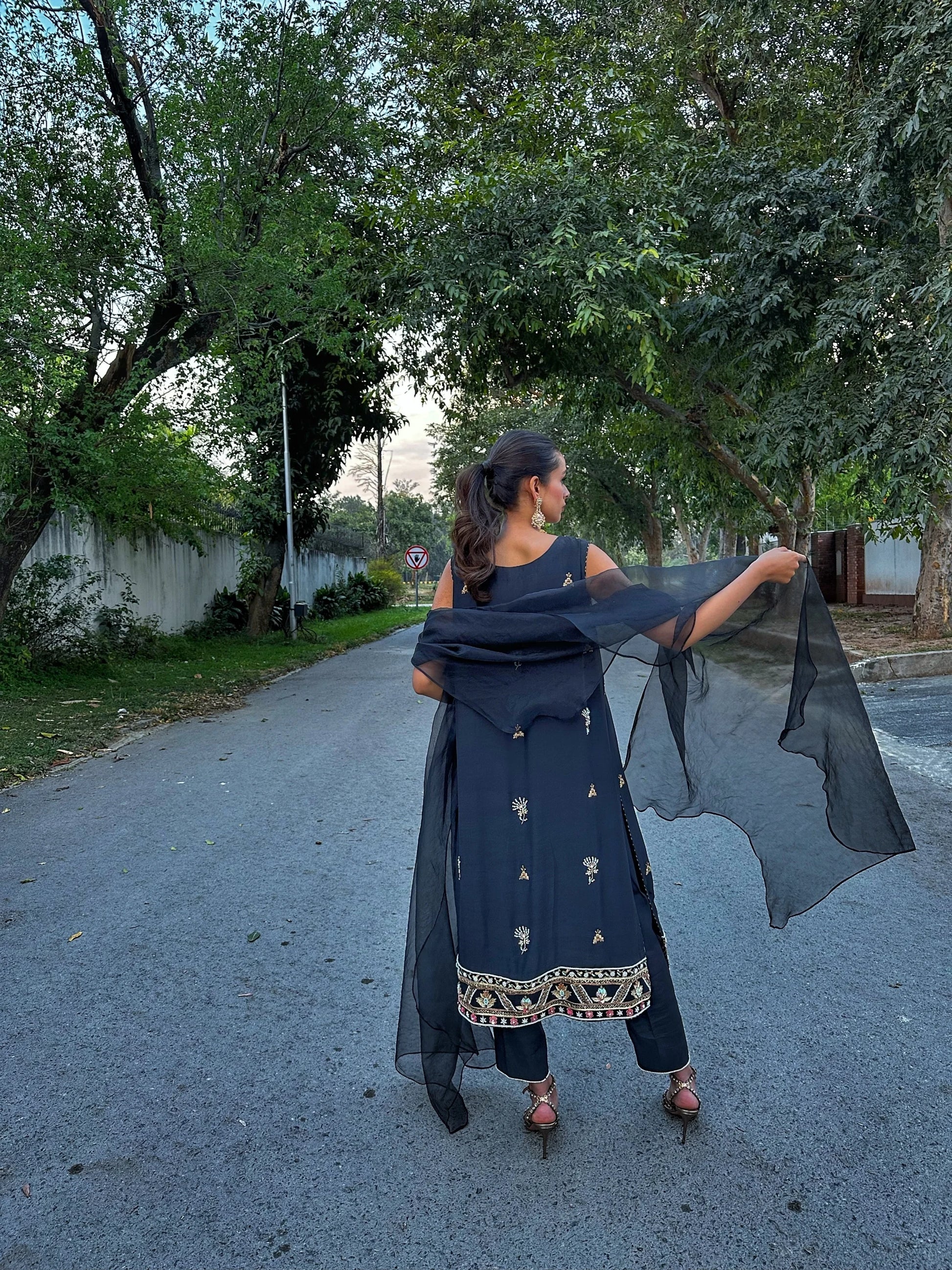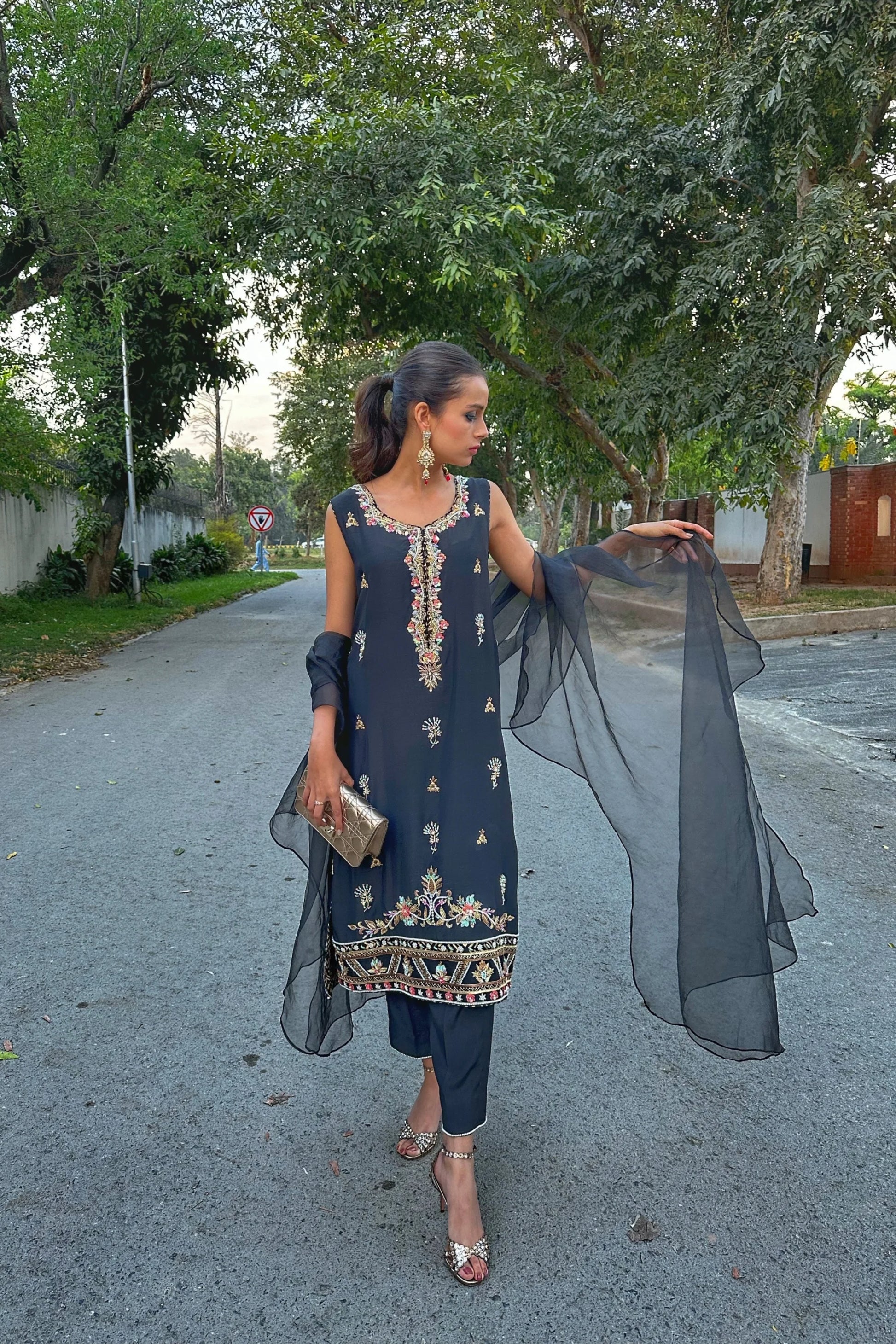 Marjan is a beautifully crafted piece in soft pastel hues, designed for those who seek both elegance and charm. This long shirt is artfully worked on both the front and back with contrasting shades and subtle hints of ferozee. The neckline and hem are adorned with vibrant pops of pink florals and meticulously handcrafted motifs that bring depth and interest to this timeless piece. Paired with cigarette trousers for a sleek finish and an organza ruffle dupatta to add a delicate touch. Available in both black and peach, Marjan is the perfect blend of tradition and contemporary style.