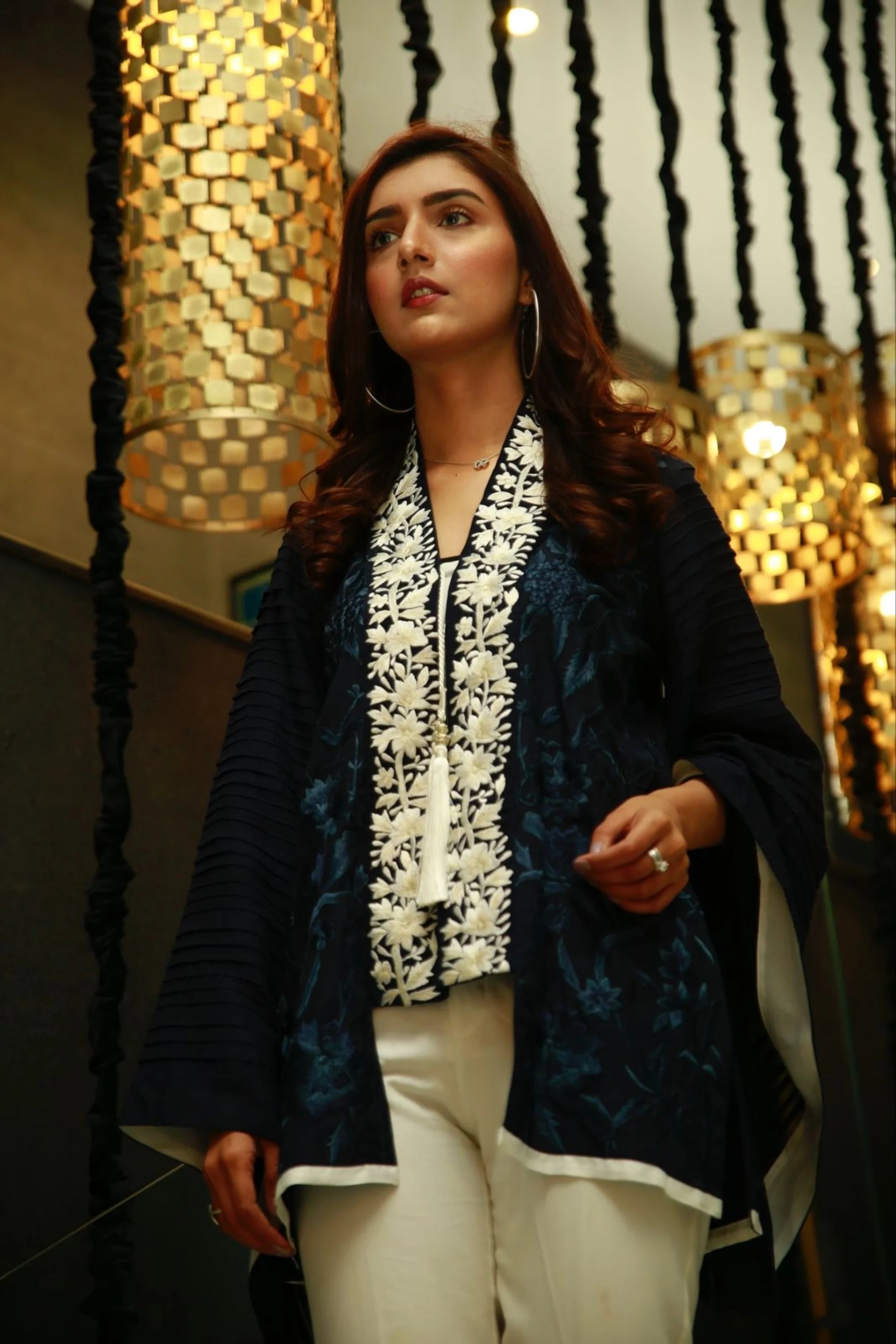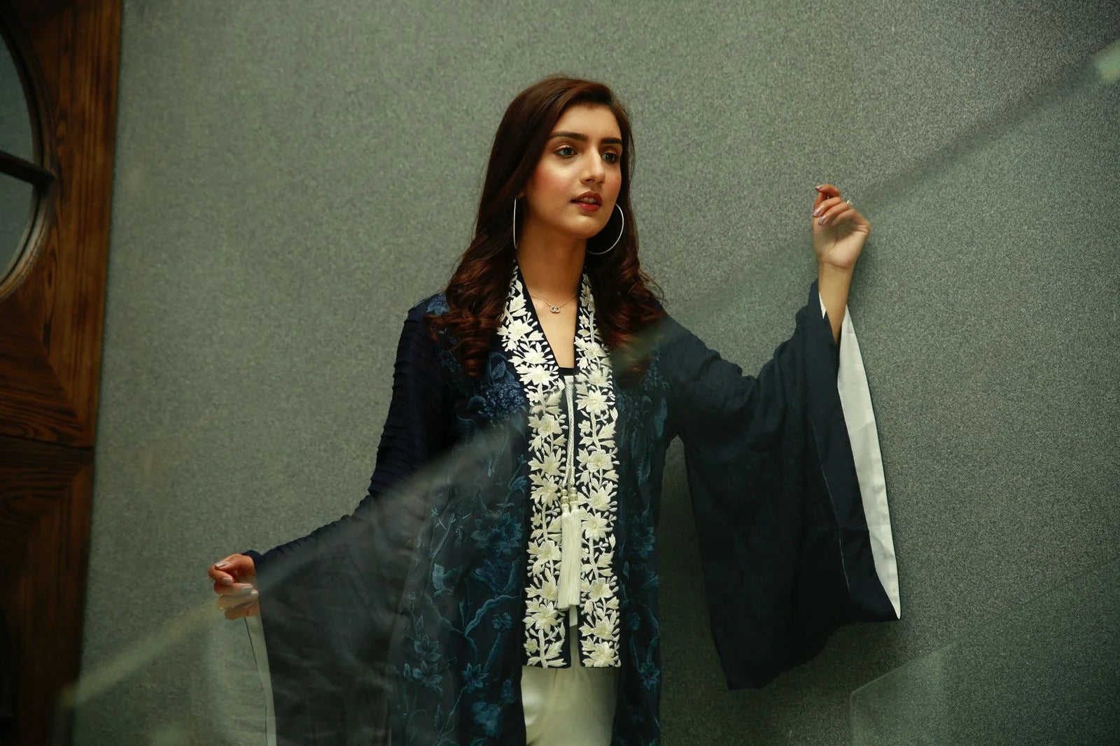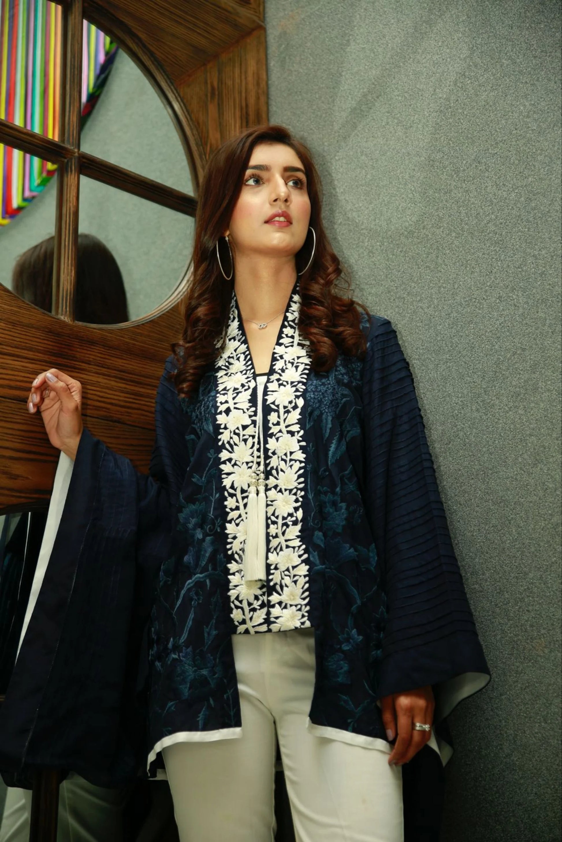 An elegant black kimono-style shirt with pleated sleeves and traditional gara embroidery. A timeless statement piece, rich in heritage and design.
