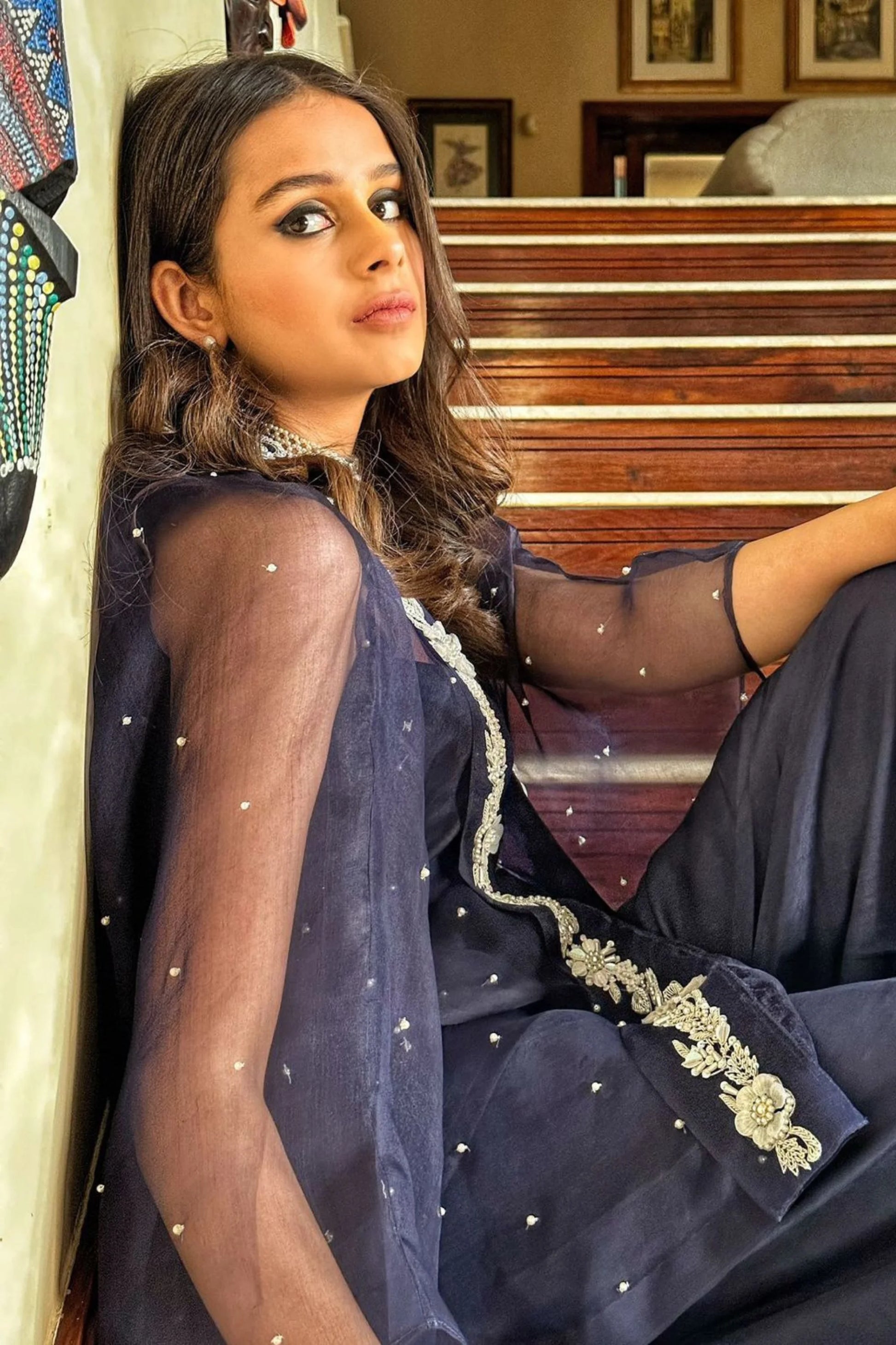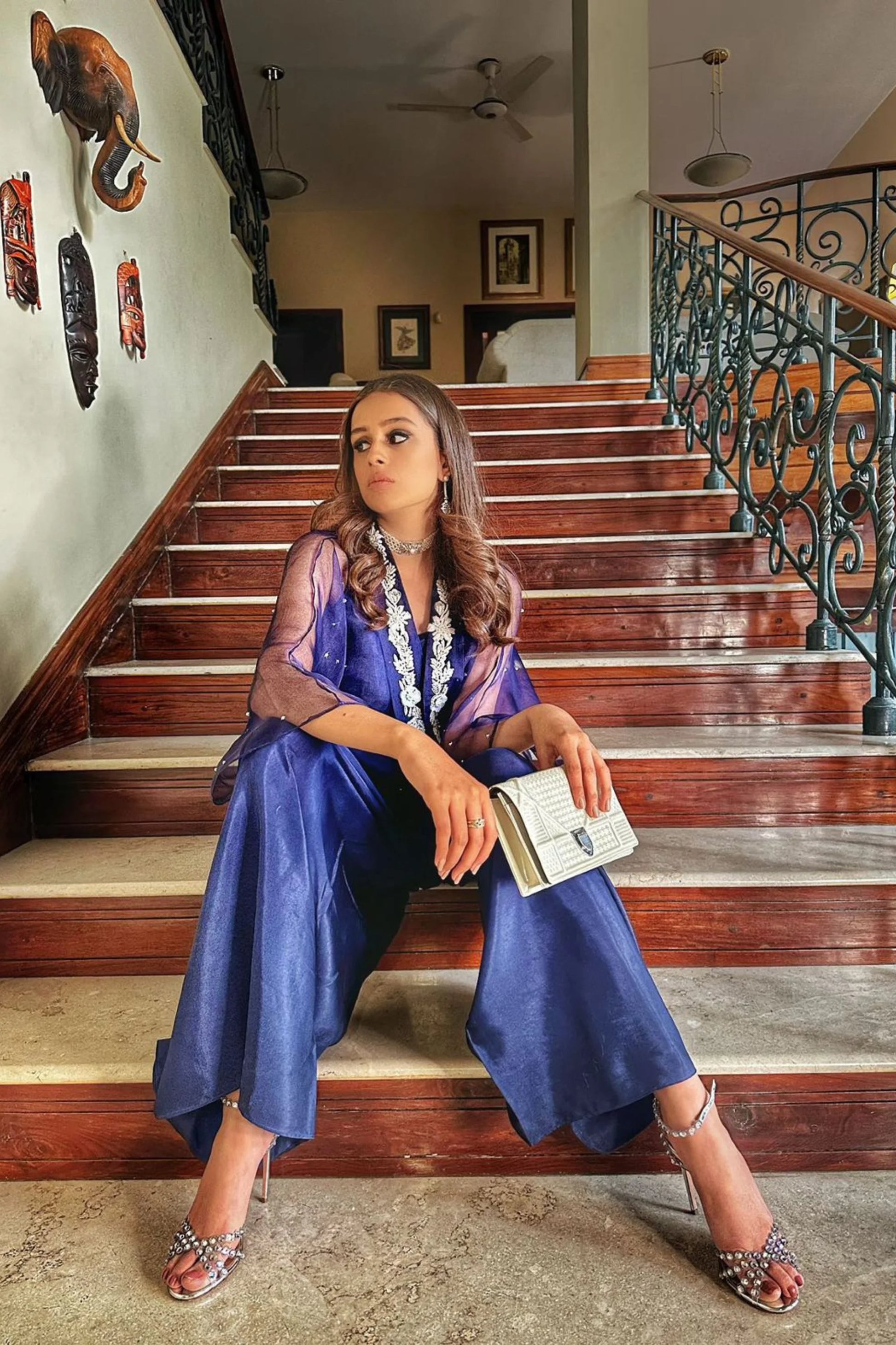 An organza short jacket detailed with lace and floral embroidery. Worn over wide-leg trousers, ideal for festive gatherings or sunlit summer events.