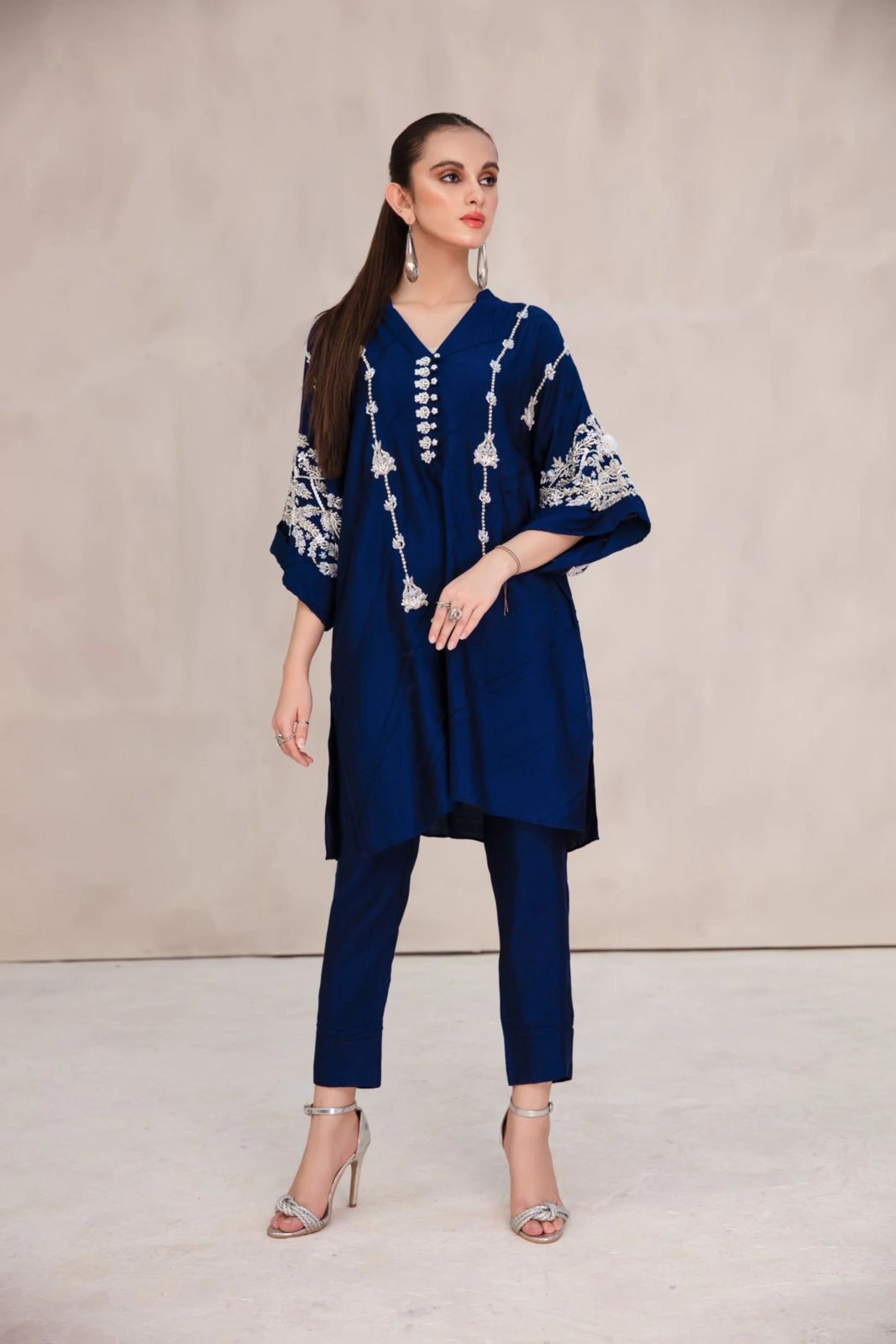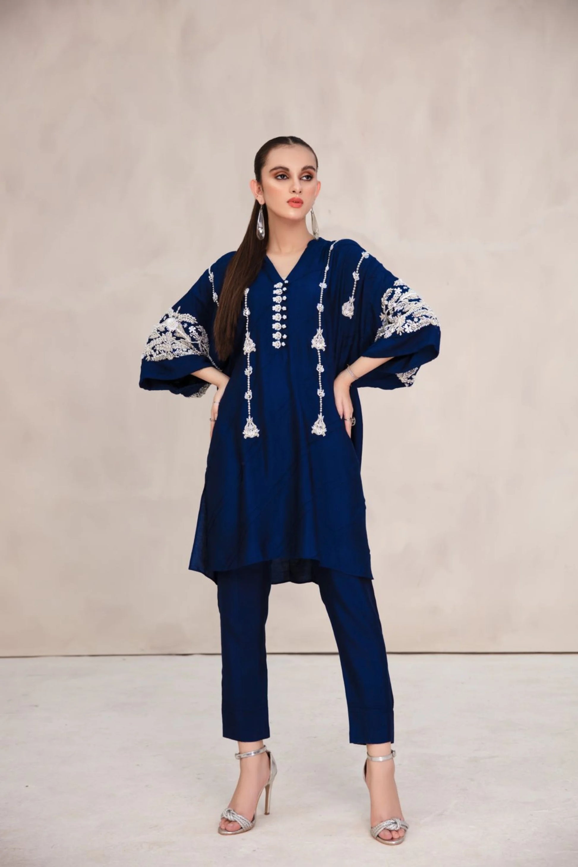 A pleated Thai silk shirt with kimono sleeves, adorned with pearl embellishments and delicate embroidery. The look is completed with matching pleated trousers. Understated glamour, redefined.